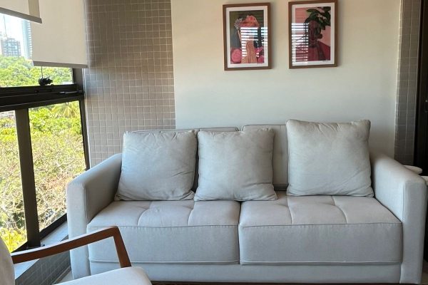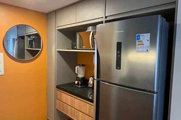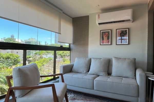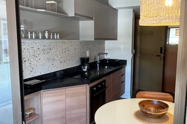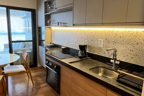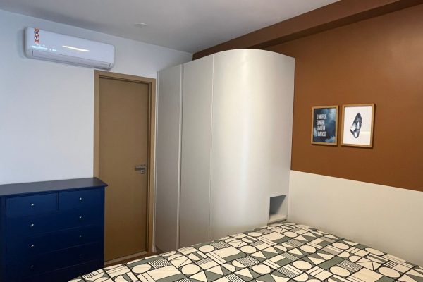 Todo projetado com móveis planejados, o apartamento foi pensado para acomodar um casal com todo conforto e praticidade. Para aumentar seu conforto, instalamos aparelhos de ar-condicionado tanto no quarto quanto na sala/varanda.